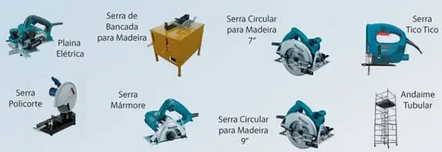 Principais equipamentos disponíveis para locação